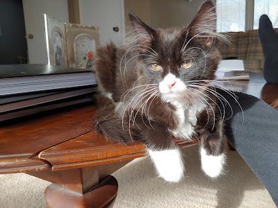 Arien is so long and slender now! Her tail seems unnaturally long. She loves to cuddle in my lap while I am working, and she purrs until she falls asleep. She like's to gently reach out and put her paw on my face, as if she's trying to pet me. She's really quite a sweetheart. But, she is a kitten with SO much energy. She plays a lot! She loves all toys and plenty of things that aren't toys too. Beren doesn't like sharing his toys and will sometimes take them away from her, even though he doesn't want to play with it. Kira and Arien spend lots of time wrestling and chasing each other through the house. Arien usually doesn't like being held and instead prefers to ride on your shoulders. She's amazingly good at balancing on someone's shoulders as they walk around, and she does it without digging her claws in. She's an awesome cat, and we are so glad we saved her!